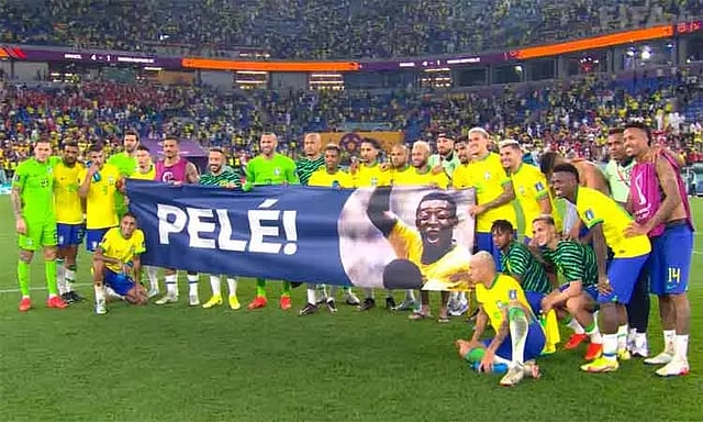 இதனிடையே பிரேசிலின் கால்பந்து ஜாம்பவானான 82 வயது பீலே கொரோனா தொற்று காரணமாக சாவ் பாலோ நகரில் உள்ள ஆஸ்பத்திரியில் அனுமதிக்கப்பட்டு சிகிச்சை பெற்று வருகிறார். இந்த நிலையில் தென்கொரியாவுக்கு எதிரான ஆட்டம் முடிந்ததும் மைதானத்தில் பிரேசில் அணி வீரர்கள் பீலேவின் உருவம் மற்றும் பெயர் பொறித்த பேனரை கையில் பிடித்தபடி போஸ் கொடுத்தனர்.