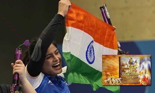 இந்நிலையில் ஒலிம்பிக் போட்டிகளில் தான் பதக்கம் வெல்ல பகவத் கீதை காரணமாக இருந்துள்ளதாக வெண்கலம் வென்ற மனு பாக்கர் தெரிவித்துள்ளார். இதுதொடர்பாக அவர் கூறுகையில், "இந்தியாவுக்கு நீண்ட காலமாகக் கிடைக்க வேண்டிய பதக்கம் இது. நான் அதற்கான ஒரு கருவியாக மட்டுமே இருந்தேன் என்றே சொல்ல வேண்டும். இந்தியா இன்னும் அதிகமான பதக்கங்களைப் பெற தகுதியானது. இந்த முறை அதிக பதக்கங்களை வெல்ல முடியும் என நம்புகிறோம். தனிப்பட்ட முறையில் என்னால் இது நம்பவே முடியவில்லை.