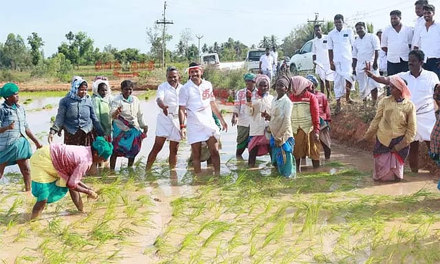 அந்தவகையில், கந்தர்வகோட்டை பகுதியில் இன்று கருப்பையா வாக்குசேகரிப்பில் ஈடுபட்டார். அப்போது, வயலில் நாற்று நடவு செய்துகொண்டிருந்த பெண்களை சந்தித்தார். பின்னர், திடீரென வயலில் இறங்கிய அ.தி.மு.க. வேட்பாளர் கருப்பையா பெண்களுடன் நாற்றுநட்டு தேர்தல் பிரசாரத்தில் ஈடுபட்டார்.