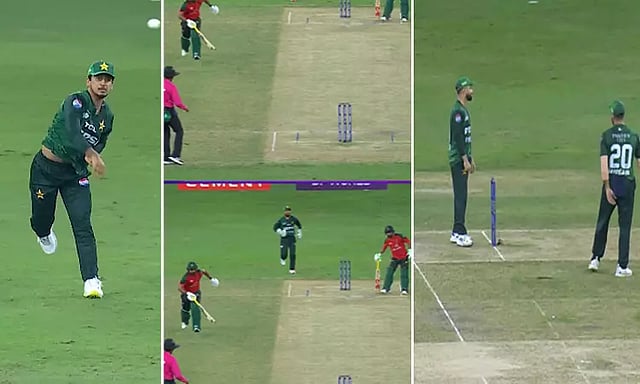 இதனை கவனிக்காத மறுமுனையில் இருந்த சைப் ஹசன் ரன் எடுக்க அவசரப்பட்டு ஓடி பேட்ஸ்மேன் முனைக்கு சென்றுவிட்டார். இதனால் பாகிஸ்தான் அணிக்கு எளிதாக ரன் அவுட் செய்யும் வாய்ப்பு உருவானது. பந்தை பிடித்த அயூப் பவுலர் முனை ஸ்டம்ப் நோக்கி வீசினார். பந்து ஸ்டம்ப் மீது படாமல் தாண்டி சென்றது. அந்த முனையில் பந்தை பிடிக்க பாகிஸ்தான் வீரர்கள் யாருமில்லை. இருப்பினும் மற்றொரு பாகிஸ்தான் வீரர் தடுத்தார். ஆனால் பந்தை சரியாக பிடிக்காமல் கோட்டை விட்டார். இந்த வாய்ப்பை பயன்படுத்தி சைப் ஹசன் மீண்டும் கிரீசுக்குள் வந்துவிட்டார். இந்த வீடியோ இணையத்தில் வைரலாகி வருகிறது. இதனை பார்த்த ரசிகர்கள் பாகிஸ்தான் அணியை கிண்டலடித்து வருகின்றனர்.