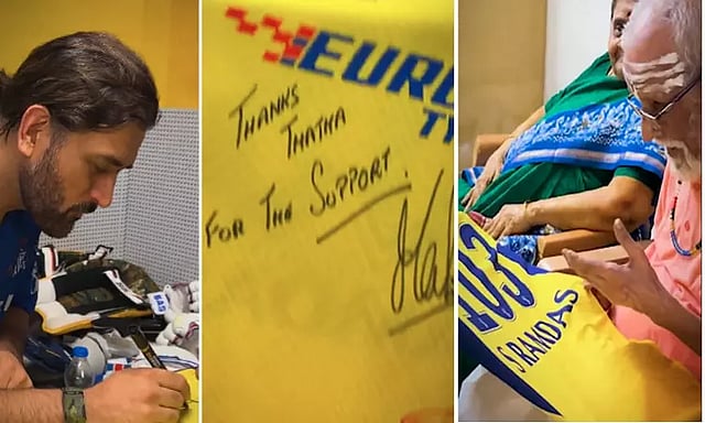 இந்த நிலையில் தன்னுடைய ரசிகர் பற்றி தெரிந்து கொண்ட தோனி ஆச்சரியமடைந்து அவருக்கு ஒரு அன்பு பரிசளித்திருக்கிறார். சி.எஸ்.கே. அணியின் ஜெர்சியில் உங்களுடைய ஆதரவுக்கு மிகவும் நன்றி தாத்தா என்று தோனி குறிப்பிட்டு கையெழுத்திட்டு அவருக்கு கொடுத்திருக்கிறார்.