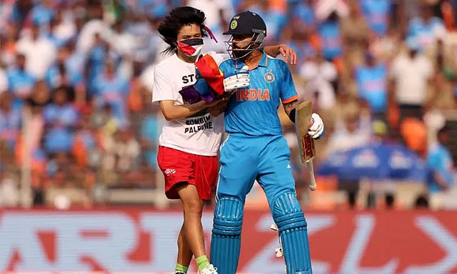 இதனிடையே, இறுதிப்போட்டியில் இந்தியா பேட்டிங் செய்தபோது 14வது ஓவரில் ஆடுகளத்திற்குள் புகுந்த ரசிகர் ஆட்டத்தில் இடையூறு ஏற்படுத்தினார். மேலும், அவர் முகத்தில் முகமூடியுடன், பாலஸ்தீனத்திற்கு ஆதரவாக டி-சர்ட் அணிந்துகொண்டு விராட் கோலி நோக்கி வேகமாக ஓடி வந்தார்.
