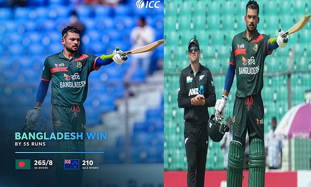 நியூசிலாந்து- வங்காளதேசம் அணிகள் இடையிலான 3-வது மற்றும் கடைசி ஒருநாள் கிரிக்கெட் போட்டி சட்டோகிராமில் நேற்று நடந்தது. இதில் முதலில் பேட் செய்த வங்காளதேச அணி 50 ஓவர்களில் 8 விக்கெட்டுக்கு 265 ரன்கள் எடுத்தது. நஜ்முல் ஹூசைன் ஷன்டோ (105 ரன்) சதமும், லிட் டான் தாஸ் (76 ரன்) அரைசதமும் அடித்தனர். நியூசிலாந்து தரப்பில் வில்லியம் ஓ ரூர்கே 3 விக்கெட்டும், பென் லிஸ்டர். ஜெய்டன் லினாக்ஸ் தலா 2 விக்கெட்டும் கைப்பற்றினர். தொடர்ந்து ஆடிய நியூசிலாந்து அணி 44.5 ஓவர்களில் 210 ரன்னில் ஆல்-அவுட் ஆனது. இதனால் வங்காளதேச அணி 55 ரன் வித்தியாசத்தில் வெற்றி பெற்றது.