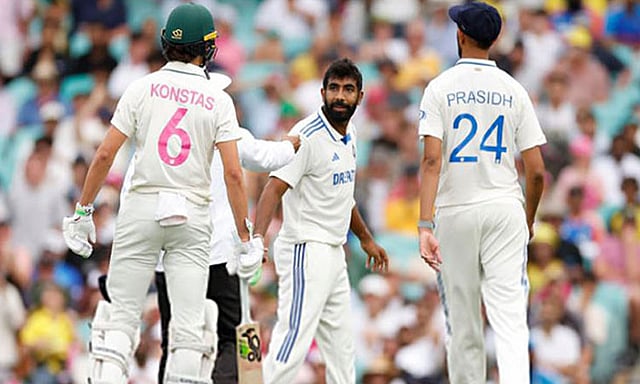 இந்த டெஸ்டின் முதல் நாள் ஆட்டத்தின் இறுதி ஓவரை இந்திய வேகப்பந்து வீச்சாளர் ஜஸ்பிரித் பும்ரா வீசினார். அவர் ஒரு பந்தை வீசுவதற்கு சில அடி ஓடி வந்தபோது, பேட்ஸ்மேன் கவாஜா இன்னும் தயாராகவில்லை என நடுவர் சிக்னல் காட்டினார். இதனால் அதிருப்தியடைந்த பும்ரா என்னப்பா இது.... என்பது போல் இரு கைகளையும் விரித்தபடி கேட்க, எதிர்முனையில் நின்ற இளம் பேட்ஸ்மேன் கான்ஸ்டாஸ் அவரை ஏதோ சொல்லி சீண்டினார்.