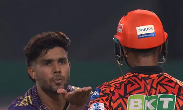 ஐ.பி.எல். தொடரில் நேற்றிரவு நடைபெற்ற லீக் ஆட்டத்தில் சன்ரைசர்ஸ் அணியை வீழ்த்தி கொல்கத்தா வெற்றி பெற்றது. இந்த ஆட்டத்தில் சன்ரைசர்ஸ் அணி பேட்டிங் செய்யும்போது ஆறாவது ஓவரை வீசிய கொல்கத்தா பவுலர் ஹர்ஷித் ராணா, மயங்க் அகர்வால் விக்கெட்டை வீழ்த்தினார். மயங்க் அகர்வால் அவுட் ஆகி வெளியேறும்போது அவரைப் பார்த்து சிரித்த ஹர்ஷித் ராணா அவருக்கு கைகளால் முத்தத்தை பறக்க விட்டு, பின் முறைத்துப் பார்த்தார். இந்த காட்சி சமூக ஊடகங்களில் வேகமாக பரவியது.