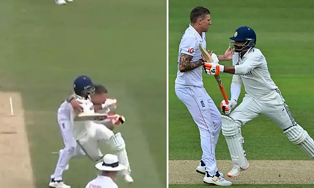 இந்த இன்னிங்சின் 35வது ஓவரை பிரைடன் கார்ஸ் வீசினார். அந்த ஓவரின் கடைசி பந்தில், ஜடேஜா 2 ரன்கள் அடித்தார். அதில் முதல் ரன் எடுக்க ஓடியபோது ஜடேஜா- பிரைடன் கார்ஸ் ஒருவருக்கொருவர் தெரியாமல் மோதி கொண்டனர். அப்போது பிரைடன் கார்ஸ் வேண்டுமென்றே ஜடேஜாவின் கழுத்தை பிடித்து இழுப்பதுபோல் தெரிந்தது. இருப்பினும் ஜடேஜா 2-வது ரன்னையும் ஓடி எடுத்துவிட்டார்.
