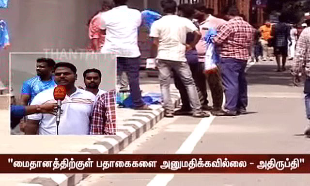 குறிப்பாக, இந்த போட்டியை பார்ப்பதற்காக பாகிஸ்தான், ஜெர்மனி, தென் ஆப்ரிக்கா உட்பட பல்வேறு நாடுகளில் இருந்தும், இந்தியாவின் பல்வேறு நகரங்களில் இருந்தும் ஏராளமான ரசிகர்கள் சேப்பாக்கம் மைதானத்திற்கு வருகை புரிந்தனர். இந்த நிலையில், மைதானத்திற்குள் பதாகைகளை கொண்டுசெல்ல ரசிகர்களுக்கு அனுமதி மறுக்கப்பட்டதால், ரசிகர்கள் அதிருப்தியடைந்தனர்.