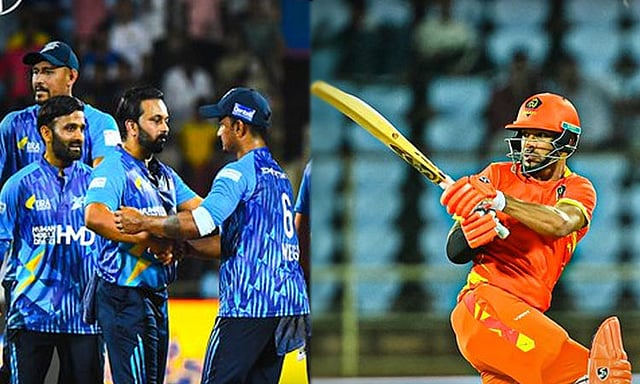 முன்னாள் நட்சத்திர கிரிக்கெட் வீரர்கள் பங்கேற்கும் 'லெஜண்ட்ஸ் லீக் டி20 கிரிக்கெட்' தொடரின் 3வது சீசன் இந்தியாவில் நடைபெற்று வருகிறது. இந்த தொடரில் நேற்று நடைபெற்ற ஆட்டத்தில் ஷிகர் தவான் தலைமையிலான குஜராத் கிரேட்ஸ் அணியும், தினேஷ் கார்த்திக் தலைமையிலான சதர்ன் சூப்பர் ஸ்டார்ஸ் அணியும் மோதின.
