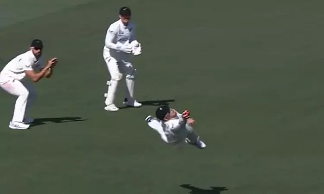 இங்கிலாந்து தரப்பில் ஹாரி புரூக் 132 ரன்னுடனும், பென் ஸ்டோக்ஸ் 37 ரன்னுடனும் களத்தில் உள்ளனர். நியூசிலாந்து தரப்பில் நாதன் ஸ்மித் 2 விக்கெட்டுகள் வீழ்த்தினார். நாளை 3ம் நாள் ஆட்டம் நடைபெறுகிறது. இந்த போட்டியில் நியூசிலாந்து வீரர் கிளென் பிலிப்ஸ் பிடித்த கேட்ச் ஒன்று சமூக வலைதளங்களில் வைரலாகி வருகிறது. இங்கிலாந்தின் முதல் இன்னிங்சில் 53 ஓவரை டிம் சவுதி வீசினார். அந்த ஓவரின் 2-வது பந்தில் போப் அடித்த பந்தை நியூசிலாந்து அணியின் சிறந்த பீல்டரான கிளென் பிலிப்ஸ் பாய்ந்து பிடித்தார்.