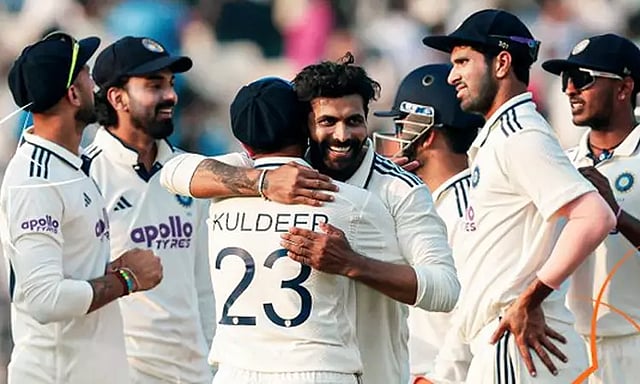 பின்னர் 30 ரன்கள் பின்தங்கிய நிலையில் 2-வது இன்னிங்சை தொடங்கிய தென் ஆப்பிரிக்க அணி ஆரம்பம் முதலே இந்திய சுழற்பந்துவீச்சை தாக்குப்பிடிக்க முடியாமல் சீரான இடைவெளியில் விக்கெட்டுகளை இழந்தது. குறிப்பாக ஜடேஜா தென் ஆப்பிரிக்க விக்கெட்டுகளை வேகமாக கைப்பற்றினார்.
