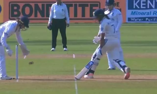 கீப்பரிடம் பந்து வருவதற்குள் கிரீஸ்-க்குள் செல்ல தேவையான நேரம் இருந்தும், அலட்சியமாக ஓடிவந்து ரன் அவுட்டில் வெளியேறினார். இதனால் 49 ரன்களில் ஆட்டமிழந்த ஹர்மன்ப்ரீத் கவுர் சர்வதேச டெஸ்ட் கிரிக்கெட்டில் முதல் அரைசதம் அடிக்கும் வாய்ப்பை தவறவிட்டுள்ளார்.