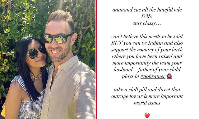 இந்நிலையில் ஆஸ்திரேலிய அணியின் ஆல்-ரவுண்டர் கிளென் மேக்ஸ்வெல்லின் மனைவி வினி ராமன் தமிழகத்தை பூர்வீகமாக கொண்டவர். வினிராமன் ஆஸ்திரேலியா வெற்றி பெற்றதை தனது இன்ஸ்டாகிராம் பக்கத்தில் பதிவிட்டார். இதைக் கண்ட பல இந்திய ரசிகர்கள் அவருக்கு அருவருக்கத்தக்க மெசேஜ்கள் அனுப்பியுள்ளனர்.