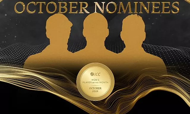 சர்வதேச கிரிக்கெட் கவுன்சில் (ஐ.சி.சி) ஒவ்வொரு மாதமும் சிறந்த கிரிக்கெட் வீரர் மற்றும் வீராங்கனையை தேர்வு செய்து கவுரவித்து வருகிறது. அதன்படி அக்டோபர் மாதத்திற்கான சிறந்த வீரர் மற்றும் வீராங்கனையை தேர்வு செய்ய தலா 3 வீரர் மற்றும் வீராங்கனைகளை ஐ.சி.சி அறிவித்துள்ளது.