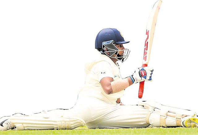 அடுத்து புஜாரா, பிரித்வி ஷாவுடன் இணைந்தார். இளம் புயல் பிரித்வி ஷா அதிரடியாக ஆடினார். புஜாரா நிதான போக்கை கடைப்பிடித்தார். அணியின் ஸ்கோர் 96 ரன்களை எட்டிய போது தொடக்க ஆட்டக்காரர் பிரித்வி ஷா (66 ரன், 69 பந்து, 11 பவுண்டரி) டேனியல் பாலின்ஸ் பந்து வீச்சில் போல்டு ஆனார்.