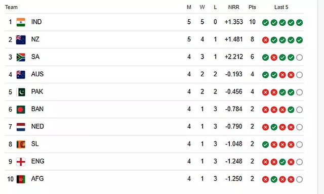 இந்த வெற்றியின் மூலம் 2023 ஒருநாள் உலகக் கோப்பை கிரிக்கெட் புள்ளி பட்டியலில் இந்திய அணி தற்போது முதலிடத்தில் உள்ளது. இதன்படி 10 புள்ளிகளுடன் இந்தியா முதலிடத்திலும், 8 புள்ளிகளுடன் நியூசிலாந்து 2-வது இடத்திலும், 6 புள்ளிகளுடன் தென் ஆப்பிரிக்கா 3-வது இடத்திலும், 4 புள்ளிகளுடன் ஆஸ்திரேலியா, பாகிஸ்தான் ஆகிய அணிகள் முறையே 4 மற்றும் 5-வது இடத்தில் உள்ளன.