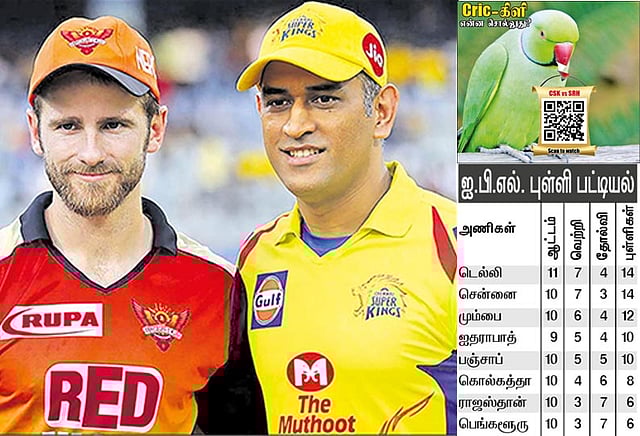 சென்னை, ஐதராபாத் அணிகள் இதுவரை 11 முறை நேருக்கு நேர் சந்தித்துள்ளன. இதில் சென்னை அணி 8 முறையும், ஐதராபாத் அணி 3 தடவையும் வெற்றி பெற்று இருக்கின்றன. இரவு 8 மணிக்கு தொடங்கும் இந்த போட்டியை ஸ்டார் ஸ்போர்ட்ஸ் சேனல் நேரடியாக ஒளிபரப்பு செய்கிறது.