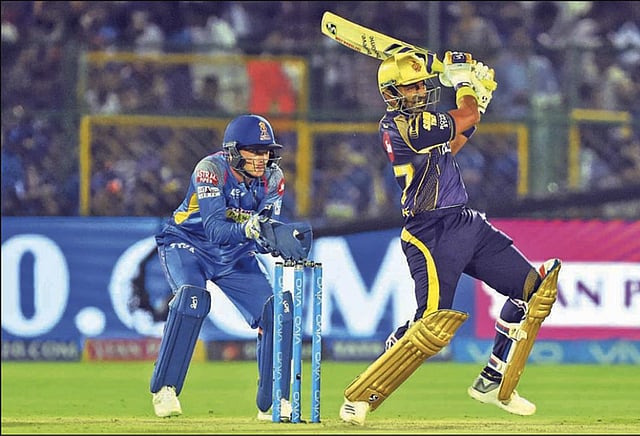 கொல்கத்தா அணி 18.5 ஓவர்களில் 3 விக்கெட் இழப்புக்கு 163 ரன்கள் குவித்து 7 விக்கெட் வித்தியாசத்தில் 3-வது வெற்றியை பெற்றது. கேப்டன் தினேஷ் கார்த்திக் 42 ரன்களுடனும் (23 பந்து, 2 பவுண்டரி, 2 சிக்சர்), நிதிஷ் ராணா 35 ரன்களுடனும் (27 பந்து, 2 பவுண்டரி, ஒரு சிக்சர்) களத்தில் இருந்தனர். இதன் மூலம் ஜெய்ப்பூரில் தொடர்ச்சியாக 9 ஆட்டங்களில் வெற்றி பெற்றிருந்த, ராஜஸ்தானின் சாதனை பயணமும் முடிவுக்கு வந்தது.