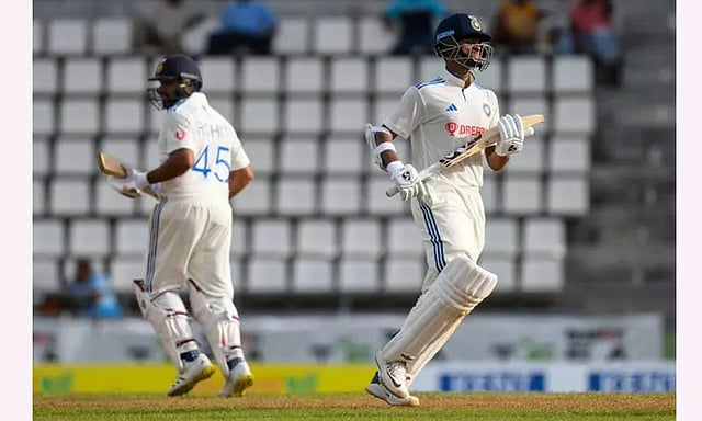 பின்னர் இந்தியாவின் முதல் இன்னிங்சை கேப்டன் ரோகித் சர்மாவும், புதுமுக வீரர் யஷஸ்வி ஜெய்ஸ்வாலும் தொடங்கினர். நேர்த்தியான பேட்டிங்கை வெளிப்படுத்திய இவர்கள் முதல் நாள் முடிவில் 23 ஓவர்களில் விக்கெட் இழப்பின்றி 80 ரன்கள் எடுத்திருந்தனர். ரோகித் சர்மா 30 ரன்னுடனும், ஜெய்ஸ்வால் 40 ரன்னுடனும் களத்தில் இருந்தனர்.