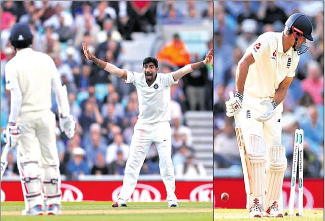 மிகவும் பொறுமையாக விளையாடிய இந்த ஜோடியை வேகப்பந்து வீச்சாளர் பும்ரா பிரித்தார். அவரது பந்து வீச்சில் அலஸ்டயர் குக் (71 ரன், 190 பந்து, 8 பவுண்டரி) ஆட்டம் இழந்தார். பந்து அவரது பேட்டின் உள்பகுதியில் பட்டு ஸ்டம்பை தாக்கியது. அடுத்த வந்த கேப்டன் ஜோ ரூட் (0) அதே ஓவரில் எல்.பி.டபிள்யூ. ஆனார். டி.ஆர்.எஸ். முறைப்படி அப்பீல் செய்தும் பலன் இல்லை. தொடர்ந்து விக்கெட் கீப்பர் ஜானி பேர்ஸ்டோவை (0) இஷாந்த் ஷர்மா காலி செய்தார்.