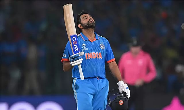 ஒட்டுமொத்தமாக ஒருநாள் கிரிக்கெட்டில் இவர் அடிக்கும் 31-வது சதம் இதுவாகும். இதே நேரம் உலகக்கோப்பை கிரிக்கெட்டில் ஆயிரம் ரன்களையும் கடந்து சாதனையை படைத்தார். மறுமுனையில் சற்று அதிரடியாக விளையாட ஆரம்பித்த இஷான் கிஷன் துரதிஷ்டவசமாக 47 ரன்களில் ஆட்டமிழந்தார். முதல் விக்கெட்டிற்கு ரோகித் சர்மா, இஷான் கிஷன் ஜோடி 156 ரன்கள் விளாசியது. அடுத்து உள்ளே வந்த விராட் கோலி நிதானமாக ரன் குவிக்க ஆரம்பித்தார். சதம் கடந்து விளையாடி வந்த ரோகித் சர்மா 84 பந்துகளுக்கு 131 ரன்கள் அடித்து அவுட் ஆனார். இவர் 16 பவுண்டரிகள் மற்றும் ஐந்து சிக்சர்கள் அடித்திருந்தார்.