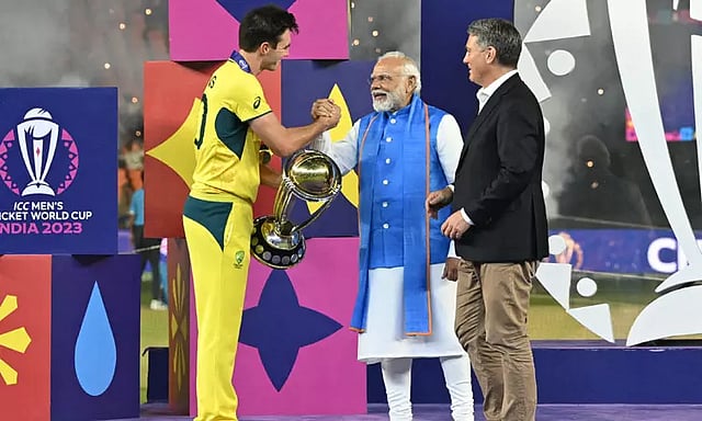 இந்திய பிரதமர் மோடி, ஆஸ்திரேலிய துணை பிரதமர் ரிச்சர்டு ஆகியோர் உலகக்கோப்பையை வழங்க அதை ஆஸ்திரேலிய கேப்டன் பேட் கம்மின்ஸ் பெற்றுக்கொண்டார்.