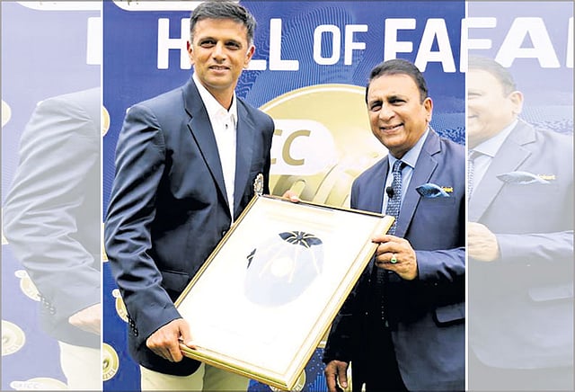 இந்த நிலையில் திருவனந்தபுரத்தில் நேற்று நடந்த இந்தியா-வெஸ்ட்இண்டீஸ் அணிகள் இடையிலான கடைசி ஒருநாள் போட்டி தொடங்கும் முன்பு இந்த பட்டியலில் சேர்க்கப்பட்டதற்கான அடையாளமாக ஐ.சி.சி.யின் நினைவுப்பரிசு டிராவிட்டுக்கு வழங்கப்பட்டது. இதனை இந்திய அணியின் முன்னாள் கேப்டன் கவாஸ்கர் வழங்கினார். ஹால் ஆப் பேம் கவுரவத்தை பெறும் 5-வது இந்திய வீரர் டிராவிட் ஆவார்.