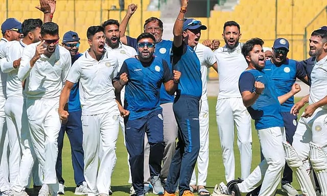 இதன் மூலம் நிர்ணயிக்கப்பட்ட 115 ரன்கள் இலக்கை நோக்கி கடைசி நாளான நேற்று 2-வது இன்னிங்சை ஆடிய சவுராஷ்டிரா 42 ரன்னுக்குள் 5 விக்கெட்டுகளை பறிகொடுத்து தள்ளாடிய போதிலும் கேப்டன் அர்பித் வசவதா நிலைத்து நின்று ஆடி அணியை வெற்றிப்பாதைக்கு அழைத்துச் சென்றார்.