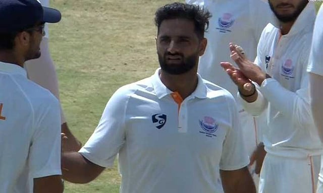 ஜம்மு காஷ்மீர் தரப்பில் நபி தார் 5 விக்கெட்டுகளை கைப்பற்றினார்.