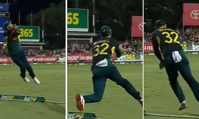 அந்த ஓவரின் முதல் பந்தில் ரன் எதுவும் அடிக்காத அவர் 2-வது பந்தை அதிரடியாக சிக்சரை நோக்கி அடித்தார். இது சிக்சருக்கு சென்று விடும் அனைவரும் நினைத்தனர். ஆனால் பவுண்டரி லைனில் பீல்டிங் செய்த மேக்ஸ்வெல் அதனை அந்தரத்தில் பாய்ந்து பிடித்தார். தரையில் கால் படும் முன் பந்தை பவுண்டரி எல்லைக்கு உள்ளே தூக்கி வீசிய அவர், தரை இறங்கியதும் பவுண்டரிக்கு வெளியே இருந்து தாவி அற்புதமாக கேட்ச் பிடித்தார். இது அங்கிருந்த ரசிகர்களை மெய்சிலிர்க்க வைத்தது. ரிக்கல்டன் அதிருப்தியுடன் வெளியேறினார். இந்த வீடியோ இணையத்தில் வைரலாகி வருகிறது.