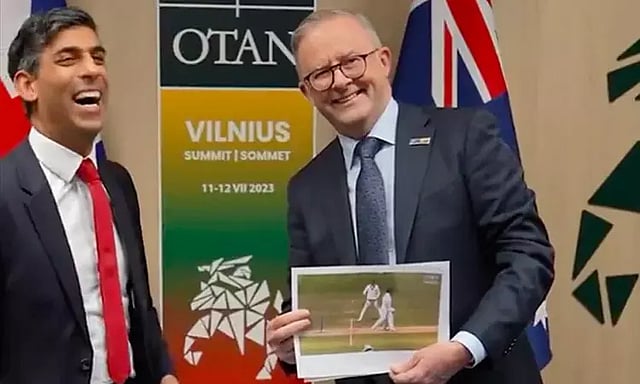இதில், இங்கிலாந்து பிரதமர் ரிஷி சுனக் மற்றும் ஆஸ்திரேலிய பிரதமர் அந்தோணி அல்பானிஸ் சந்தித்தனர். அப்போது, ஆஷஸ் டெஸ்ட்டில் 2-1 என்ற கணக்கில் நாங்கள் முன்னிலையில் உள்ளோம் என ஆஸ்திரேலிய பிரதமர் கூறினார். இதற்கான புகைப்படத்தையும் காட்டினார்.