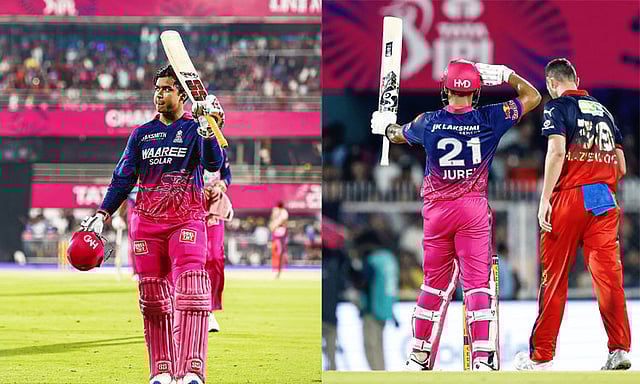 தொடர்ந்து 8 பவுண்டரிகள், 7 சிக்ஸர்களை விளாசிய சூர்யவன்ஷி, 26 பந்துகளில் 78 ரன்கள் குவித்து ஆட்டமிழந்தார். துருவ் ஜுரேல் 43 பந்துகளில் 81 ரன்கள் விளாசி இறுதிவரை ஆட்டமிழக்காமல் களத்தில் இருந்தார். இறுதியில் ராஜஸ்தான் அணி 18 ஓவர்களில் 4 விக்கெட்டுகளை இழந்து 202 எடுத்தது. இதன் மூலம் ராஜஸ்தான் அணி 6 விக்கெட் வித்தியாசத்தில் பெங்களூருவை வீழ்த்தி அபார வெற்றி பெற்றது.