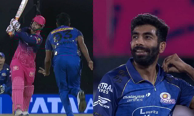 முன்னதாக இந்தப் போட்டியில், 15 வயதே ஆன இளம் புயல் வைபவ் சூர்யவன்ஷி பும்ரா ஓவரில் இரண்டு சிக்சர்களை பறக்க விட்டார். முன்னணி பந்து வீச்சாளரான பும்ரா பந்தை சூர்யவன்ஷி எப்படி எதிர்கொள்ளப் போகிறார் என்ற எதிர்பார்ப்பு ரசிகர்கள் மத்தியில் இருந்த நிலையில், பும்ராவின் முதல் பந்தையே லாங் ஆன் பகுதியில் சிக்சருக்கு தூக்கினார். சூர்யவன்ஷி சிக்சர் அடித்ததை எதிர்பார்க்காத பும்ரா, மெல்லிய புன்னகையுடன் சென்ற வீடியோ சமூக வலைத்தளங்களில் வைரலாகி வருகிறது. நெட்டிசன்கள் இந்த காட்சியை வைத்து மீம்ஸ்களை தெறிக்க விடுகின்றனர். இந்த போட்டியில் சூர்யவன்ஷி 39 ரன்களில் (14 பந்து, ஒரு பவுண்டரி, 5 சிக்சர்) ஷர்துல் தாக்கூர் வீசிய பந்தை தூக்கி அடித்து எல்லைக்கோடு அருகே கேட்ச் ஆனார்.