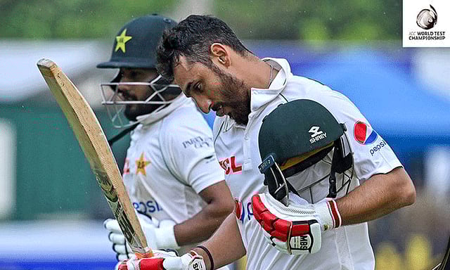 பின்னர் தனது முதல் இன்னிங்சை தொடங்கிய பாகிஸ்தான் அணிக்கு சீரான இடைவெளியில் விக்கெட் விழுந்தது. இமாம் உல்-ஹக் 1 ரன்னிலும், அப்துல்லா ஷபிக் 19 ரன்னிலும், ஷான் மசூத் 39 ரன்னிலும் வெளியேறினர். எதிர்பார்க்கப்பட்ட கேப்டன் பாபர் அசாம் (13 ரன், 16 பந்து, 2 பவுண்டரி) இடக்கை சுழற்பந்து வீச்சாளர் பிரபாத் ஜெயசூர்யா வீசிய பந்தை தடுத்து ஆட முற்பட்ட போது விக்கெட் கீப்பர் சமரவிக்ரமாவிடம் பிடிபட்டார். சர்ப்ராஸ் அகமதுவும் (17 ரன்) நிலைக்கவில்லை. அப்போது பாகிஸ்தான் 101 ரன்னுக்குள் 5 விக்கெட்டுகளை பறிகொடுத்து தடுமாறியது.