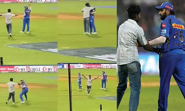 அதன்பிறகு ரோகித் சர்மாவை கட்டியணைத்து ரசிகர் தனது அன்பை வெளிப்படுத்தினார். பின்னர் கீப்பர் நின்ற இஷான் கிஷனை கட்டியணைத்து சென்றார். இது தொடர்பான வீடியோ சமூக வலைதளங்களில் வைரலாகி வருகிறது. ரோகித் சர்மா பயந்ததை ரசிகர்கள் கிண்டல் செய்து வருகின்றனர்.