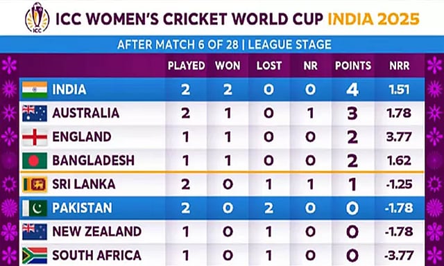 இந்த போட்டியில், பாகிஸ்தான் அணி 43 ஓவர்கள் முடிவில் 10 விக்கெட்டுகள் இழப்பிற்கு 159 ரன்கள் எடுத்தது. இதனால் இந்திய அணி 88 ரன்கள் வித்தியாசத்தில் பாகிஸ்தானை வீழ்த்தி வெற்றி பெற்றது. இந்த நிலையில், பெண்கள் உலகக்கோப்பை கிரிக்கெட் போட்டி தொடரில், மொத்தமுள்ள 28 லீக் போட்டிகளில் 6 போட்டிகள் விளையாடப்பட்டு உள்ளன. இதில், இந்தியா 2 போட்டிகளில் விளையாடி, இரண்டிலும் வெற்றி பெற்று 4 புள்ளிகளை பெற்று புள்ளிகள் பட்டியலில் முதல் இடத்தில் உள்ளது. பட்டியலில் ஆஸ்திரேலியா 2-ம் இடத்தில் (3 புள்ளிகள்) உள்ளது.