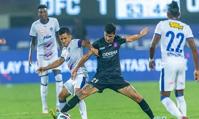 11 அணிகள் இடையிலான 9-வது இந்தியன் சூப்பர் லீக் (ஐ.எஸ்.எல்.) கால்பந்து போட்டி பல்வேறு நகரங்களில் நடந்து வருகிறது. இதில் புவனேஸ்வரில் இன்று நடந்த லீக் ஆட்டம் ஒன்றில் பெங்களூரு- ஒடிசா அணிகள் மோதின.
