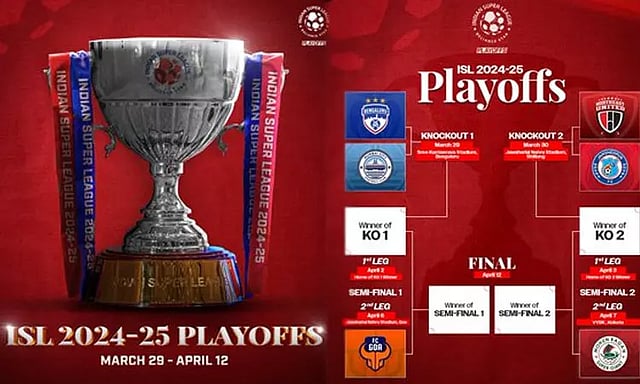 13 அணிகள் இடையிலான 11-வது இந்தியன் சூப்பர் லீக் (ஐ.எஸ்.எல்.) கால்பந்து போட்டி தொடர் இறுதி கட்டத்தை நெருங்கி விட்டது. கடந்த 12-ந் தேதி முடிந்த லீக் சுற்று முடிவில் மோகன் பகான் சூப்பர் ஜெயன்ட், எப்.சி.கோவா, பெங்களூரு எப்.சி., நார்த் ஈஸ்ட் யுனைடெட் எப்.சி., ஜாம்ஷெட்பூர் எப்.சி., நடப்பு சாம்பியன் மும்பை சிட்டி ஆகிய அணிகள் புள்ளி பட்டியலில் முதல் 6 இடங்களை பிடித்து 'பிளே-ஆப்' சுற்றுக்கு தகுதி பெற்றன.