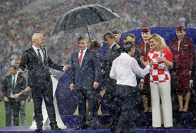 இந்நிலையில் நேற்று உலகக்கோப்பை கால்பந்து தொடரின் விருது வழங்கும் நிகழ்சியில் ரஷ்ய அதிபர் புதினுக்கு மட்டும் குடை பிடிக்கப்பட்டு, மற்ற தலைவர்கள் மழையில் நனைந்து கொண்டிருந்த சம்பவம் சலசலப்பை ஏற்படுத்தியுள்ளது. இந்த விருது வழங்கும் விழாவில் அதிபர் புதினுடன் பிரான்ஸ் அதிபர் எமானுவல் மெக்ரான், குரோஷியா அதிபர் கோலிண்டா கிராபர்-கிடரோவிக், பிபா தலைவர் ஜியானி இன்பான்டினோ ஆகியோர் பங்கேற்றனர்.