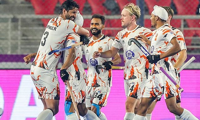இதில் நடைபெறும் மற்றொரு அரையிறுதியில் சூர்மா ஆக்கி கிளப்- ஐதராபாத் டூபான்ஸ் அணிகள் விளையாடி வருகின்றன.