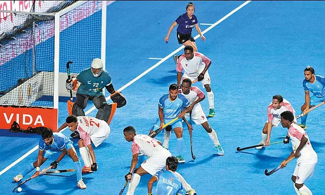 இரவில் நடந்த ஆட்டத்தில் தரவரிசையில் 2-வது இடம் வகிக்கும் இந்திய அணி, 40-வது இடத்தில் உள்ள ஓமனை சந்தித்தது. இந்த ஆட்டத்தில் இந்திய அணி 17-0 என்ற கோல் கணக்கில் ஓமனை பந்தாடி தொடர்ச்சியாக 2-வது வெற்றியை சொந்தமாக்கியது. இந்திய அணியில் தில்ராஜ் சிங் 4 கோலும், மன்மீத் சிங், அர்ஷ்தீப் சிங் தலா 3 கோலும், குர்ஜோத் சிங், அஜீத் யாதவ் தலா 2 கோலும், அன்மோல் எக்கா, ஷர்தானாந்த் திவாரி, தோனேவ்ஜம் லுவாங் தலா ஒரு கோலும் அடித்தனர்.