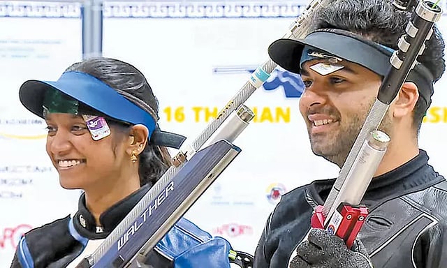 16-வது ஆசிய துப்பாக்கி சுடுதல் சாம்பியன்ஷிப் போட்டி கஜகஸ்தானில் உள்ள ஷிம்கென்ட் நகரில் நடந்து வருகிறது. இதில் நேற்று நடந்த 10 மீட்டர் ஏர் ரைபிள் கலப்பு அணிகள் பிரிவின் இறுதிப்போட்டியில் இந்தியாவின் அர்ஜூன் பபுதா-இளவேனில் இணை, சீனாவின் டிங்கி லூ-ஜின்லு பெங் ஜோடியை எதிர்கொண்டது.