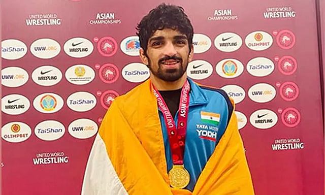 ஆசிய மல்யுத்த சாம்பியன்ஷிப் போட்டி கஜகஸ்தான் தலைநகர் அஸ்தானாவில் நடந்து வருகிறது. இதில் நேற்று நடந்த ஆண்களுக்கான 57 கிலோ உடல் எடைபிரிவின் இறுதிஆட்டத்தில் இந்திய இளம் வீரர் அமன் ஷெராவத், கிர்கிஸ்தானின் அல்மாஸ் ஸ்மன்பெகோவை எதிர்கொண்டார். விறுவிறுப்பான இந்த மோதலில் அமன் ஷெராவத் 9-4 என்ற புள்ளி கணக்கில் அல்மாஸ்சை வீழ்த்தி தங்கப்பதக்கத்தை சொந்தமாக்கினார்.