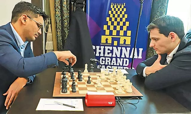 தமிழ்நாடு விளையாட்டு மேம்பாட்டு ஆணையம் சார்பில் 8 முன்னணி கிராண்ட்மாஸ்டர்கள் பங்கேற்றுள்ள சென்னை கிராண்ட்மாஸ்டர்ஸ் செஸ் போட்டி லீலா பேலஸ் நட்சத்திர ஓட்டலில் நடந்து வருகிறது. 7 சுற்றுகள் கொண்ட இந்த போட்டியில் கடைசி சுற்று முடிவில் அதிக புள்ளிகளை பெறும் வீரர் சாம்பியன் பட்டத்தை கைப்பற்றுவார்.