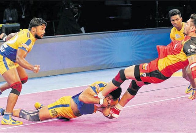 நாக்பூரில் நேற்றிரவு அரங்கேறிய 22-வது லீக் ஆட்டத்தில் அறிமுக அணியான தமிழ் தலைவாஸ், பெங்களூரு புல்சுடன் (பி பிரிவு) பலப்பரீட்சையில் இறங்கியது. இந்த முறை சுதாரிப்புடன் விளையாடிய தமிழ்தலைவாஸ் வீரர்கள் தொடக்கம் முதலே ஆதிக்கம் செலுத்தினர். முதல் பாதியில் 12-8 என்ற புள்ளி கணக்கில் முன்னிலை பெற்றிருந்த தமிழ் தலைவாஸ் அணி அந்த முன்னிலையை கடைசிவரை தக்க வைக்க கடுமையாக போராட வேண்டி இருந்தது.