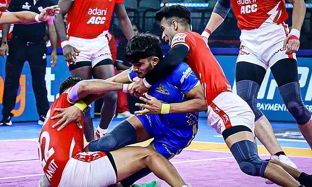 12 அணிகள் இடையிலான 12-வது புரோ கபடி லீக் தொடர் டெல்லியில் நடந்து வருகிறது. இதில் நேற்றிரவு நடந்த ஒரு ஆட்டத்தில் குஜராத் ஜெயன்ட்ஸ் - தமிழ் தலைவாஸ் அணிகள் மோதின