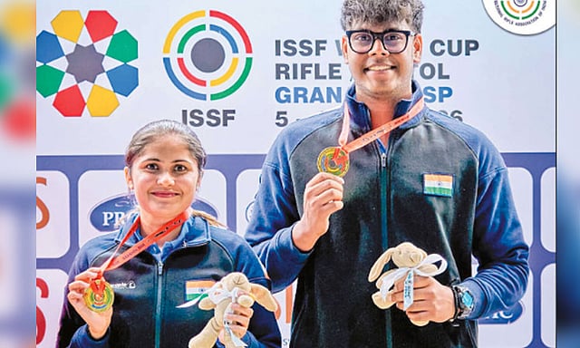 தகுதி சுற்றில் 2-வது இடத்தை பெற்ற இந்தியாவின் இளம் நட்சத்திரங் கள் பலாக்- முகேஷ் நெலவள்ளி ஜோடி இறுதி ஆட்டத்தில் 487.7 புள்ளி களுடன் முதலிடத்தை பிடித்து, புதிய உலக சாதனையுடன் தங்கப்பதக் கத்தை தட்டிச் சென்றது. சீனாவின் கியான்ஸன் யாவ்- காய் ஹூ ஜோடி வெள்ளிப்பதக்கத்தையும் (484.8 புள்ளி), ஹங்கேரியின் வெரோ னிகா மேஜர்- அகோஸ் கரோலி இணை வெண்கலப்பதக்கமும் (414.9 புள்ளி) கைப்பற்றியது.