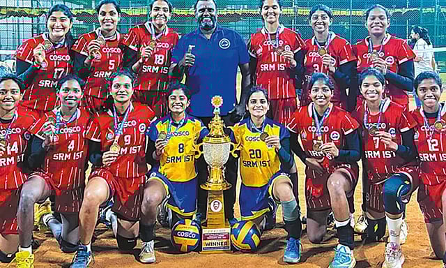 தென் மண்டல பல்கலைக்கழக பெண்கள் கைப்பந்து போட்டி சென்னையை அடுத்த அச்சரபாக்கத்தில் உள்ள எஸ்.ஆர்.எம். விவசாய கல்லூரி மைதானத்தில் கடந்த 5 நாட்கள் நடந்தது. இதில் நேற்று நடந்த 3-வது மற்றும் கடைசி லீக் ஆட்டத்தில் எஸ்.ஆர்.எம். பல்கலைக்கழகம் (தமிழ்நாடு) 25-17, 25-20, 25-12 என்ற நேர்செட்டில் பாரதியார் பல்கலைக்கழத்தை (தமிழ்நாடு) வீழ்த்தி தொடர்ச்சியாக 3-வது வெற்றியை ருசித்ததுடன் தொடர்ந்து 5-வது முறையாக சாம்பியன் பட்டத்தை கைப்பற்றியது.