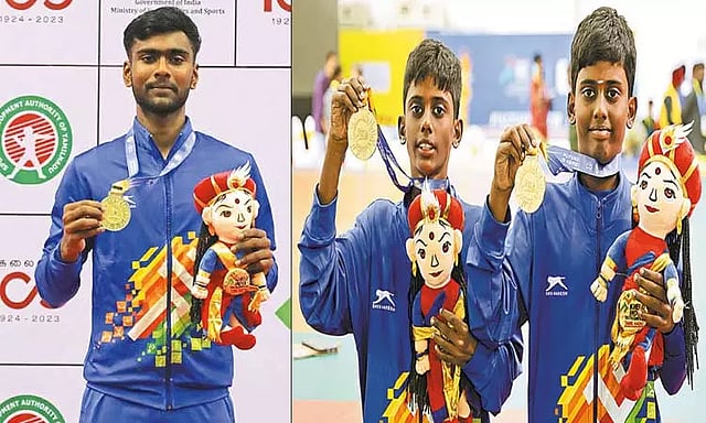 இந்த போட்டி தொடரில் முதல் தங்கப்பதக்கத்தை தமிழகம் கைப்பற்றி அசத்தியது. 2-வது நாளான நேற்று சென்னை எழும்பூரில் உள்ள ராஜரத்தினம் ஸ்டேடியத்தில் நடந்த யோகாசன போட்டியின் 'ரித்மிக்' ஆண்கள் இரட்டையர் பிரிவில் தமிழகத்தை சேர்ந்த இரட்டை சகோதரர்களான தேவேஷ்-சர்வேஷ் 127.89 புள்ளிகள் குவித்து தங்கப்பதக்கத்தை அறுவடை செய்தனர். இருவரும் காஞ்சீபுரத்தில் உள்ள அரசு பள்ளியில் 7-ம் வகுப்பு படித்து வருகிறார்கள். மேற்கு வங்காளத்தின் அவ்ரஜிட் சாஹா-நில் சர்கார் ஜோடி 127.57 புள்ளிகளுடன் வெள்ளிப்பதக்கமும், மராட்டியத்தின் குஷ் சரண் இங்கோலே-யாட்நேஷ் ரவீந்திரா வான்கடே இணை 127.20 புள்ளிகளுடன் வெண்கலப்பதக்கமும் பெற்றனர்.