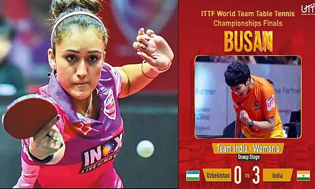 இதில் தொடக்கம் முதலே ஆதிக்கம் செலுத்திய இந்தியா 3-0 என்ற கணக்கில் உஸ்பெகிஸ்தானை தோற்கடித்து தொடர்ச்சியாக 2-வது வெற்றியை ருசித்து தனது பிரிவில் 2-வது இடத்தில் உள்ளது. ஒற்றையர் ஆட்டங்களில் இந்திய வீராங்கனைகள் அர்ச்சனா காமத் 11-7, 11-3, 11-6 என்ற நேர்செட்டில் ரிமா கப்ரானோவையும், மணிகா பத்ரா 11-7, 11-4, 11-1 என்ற நேர்செட்டில் மார்காபோ மாக்டிவாவையும், தியா சிதாலே 11-6, 10-12, 11-4, 11-6 என்ற செட் கணக்கில் ரோஜாலினா காட்ஜிய்வாவையும் வீழ்த்தினர். இந்திய வீராங்கனைகள் அயிகா முகர்ஜி, ஸ்ரீஜா அகுலா ஆகியோருக்கு இந்த ஆட்டத்தில் ஓய்வு அளிக்கப்பட்டது.