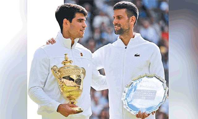 இந்த நிலையில் மிகுந்த எதிர்பார்ப்புக்கு மத்தியில் நேற்று அரங்கேறிய ஆண்கள் ஒற்றையர் இறுதிஆட்டத்தில் நடப்பு சாம்பியனும், 3-ம்நிலை வீரருமான கார்லஸ் அல்காரஸ் (ஸ்பெயின்), முன்னாள் சாம்பியனான 2-ம்நிலை வீரர் நோவக் ஜோகோவிச்சை (செர்பியா) எதிர்த்து மல்லுக்கட்டினர்.